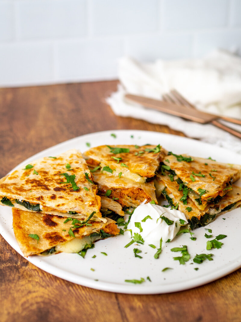 This kale and sweet potato quesadilla recipe is the ultimate comfort recipe! Made with sweet potatoes smashed with chili and oregano, kale, and brie cheese for extra cheesy, gooey satisfaction!